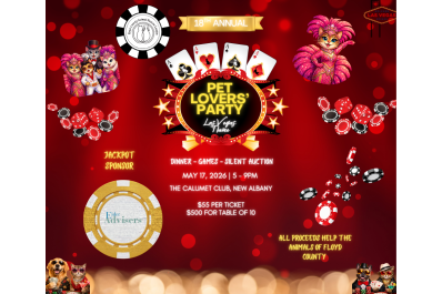 New Albany, IN. Place your bets on a night of fun for a great cause. Tickets are now on sale for the 18th Annual Pet Lovers’ Party, a Las Vegas–themed evening benefiting the Floyd County Animal Rescue League, taking place Sunday, May 17, 2026, from 5:00 to 9:00 PM at The Calumet Club in New Albany.