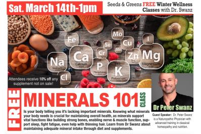 FREE Wellness Class. Is your body telling you it's lacking important minerals. Knowing what minerals your body needs is crucial for maintaining overall health, as minerals support vital functions like building strong bones, enabling nerve & muscle function, support sleep, fight fatigue, even help with thinning hair. Learn from Dr Swanz about maintaining adequate mineral intake through diet and supplements. Attendees receive 10% off any supplement not on sale.