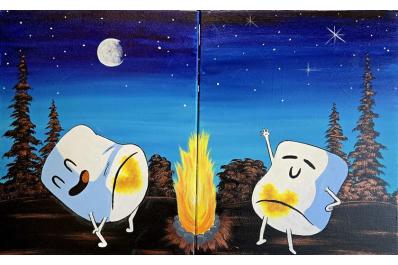 Let’s Get Toasty is a playful and cozy date-night painting that’s full of charm and personality. Two cheerful marshmallows strike silly poses beside a glowing campfire, set against a deep blue night sky sprinkled with stars and a bright moon. Warm yellows and oranges from the fire pop beautifully against the cool twilight tones, creating a fun contrast that feels lighthearted, whimsical, and perfect for sharing. This split-canvas design comes together as one adorable scene that’s guaranteed to spark smiles.