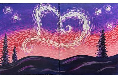 In this class, our instructor will guide you step-by-step through creating your half of this stunning split-canvas painting. The process is broken down into easy, approachable steps, making it perfect for beginners and experienced painters alike. As each canvas comes together, the full heart-filled sky is revealed, making this a meaningful and memorable experience for date night or a creative evening with friends.